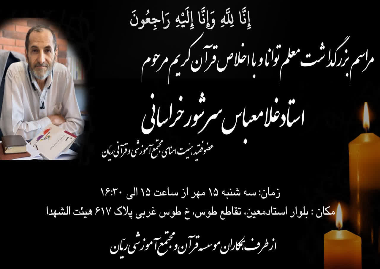 مراسم بزرگداشت معلم توانا و با اخلاص قرآن کریم مرحوم غلامعباس سرشور خراسانی با حضور استاد برجسته قرآن سید مهدی سیف و قرائت قاری بین المللی استاد هادی موحد امین در مسجد سید الشهدا واقع در خیابان دامپزشکی توسط موسسه آموزشی ریان نورالهدی برگزار شد.